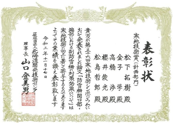 に寄与する優れた論文発表に対して贈呈される「安全の泉賞」を、寒地交通チームの