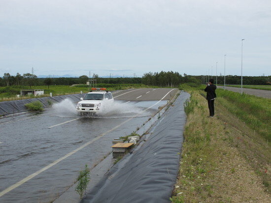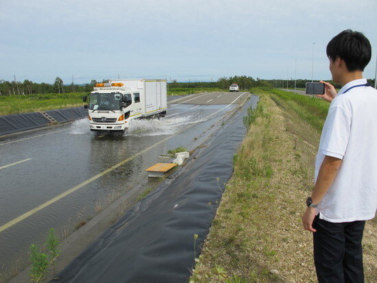 ▲連続路面すべり抵抗値測定装置(RT3)の計測状況