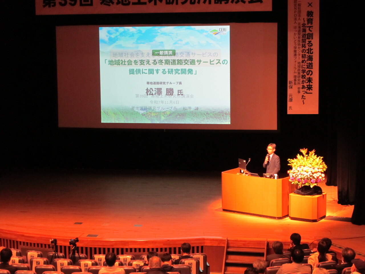 11月6日(木)に、札幌市のかでる2・7で開催された「第39回寒地土木研究所講演会」において、松澤グループ長が「地域社会を支える冬期道路交通サービスの提供に関する研究開発」と技術講演を行いました。